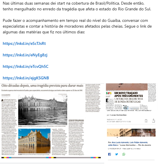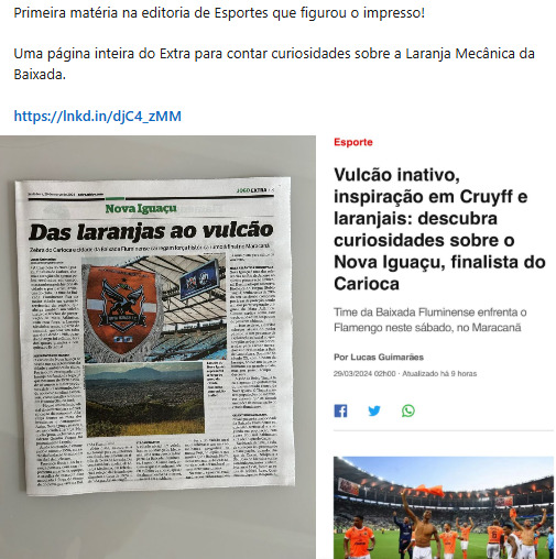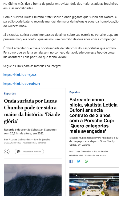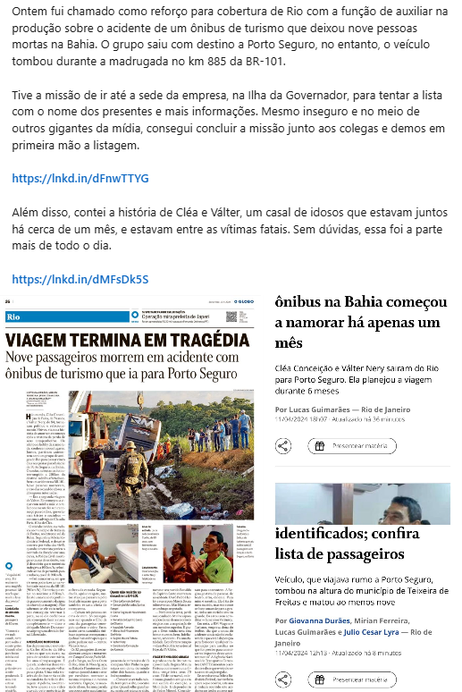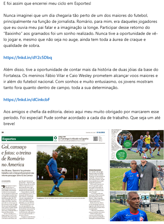 Comecei a trabalhar na redação de O Globo e do Extra em fevereiro de 2024 como estagiário de jornalismo. Em seis meses, publiquei mais de mil matérias, passando por diferentes editorias e cobrindo temas de grande relevância — do Carnaval e das Olimpíadas de Paris ao desastre climático no Rio Grande do Sul e às eleições municipais. Pude entrevistar grandes nomes como Romário e acompanhar de perto seu retorno ao America, além de atuar na apuração de reportagens diretamente das ruas do Rio.